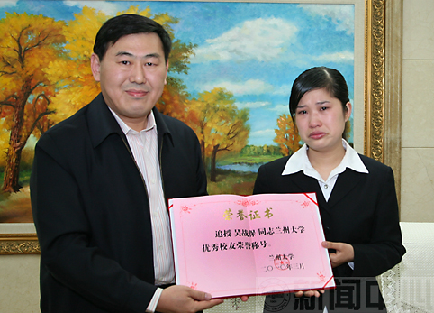 周绪红校长在会见报告团全体成员时向吴战保同志亲属颁发了“兰州大学优秀校友”证书和慰问金。他指出,培养什么样的人,怎么培养人,是我校人才培养领域一直在探索的问题。吴战保用生命诠释了兰大人的精神所在和价值追求。正如温家宝总理在今年两会期间对我校人才培养质量的评价一样,“兰州大学办得也是不错的”,“比学生的质量、素质,兰大也还是比较好的,还保持了原来的传统”。今天,学校为培养出吴战保这样爱岗敬业的学生而自豪。吴战保的英雄业绩不是一个偶然现象,是吴战保一直严格要求自己的结果,也是学校认真培养的必然结果,他的英雄事迹生动诠释了我校德智体综合发展的人才培养模式是有效的。吴战保精神很值得我们学习,感谢报告团为兰大师生送上生动的一课。